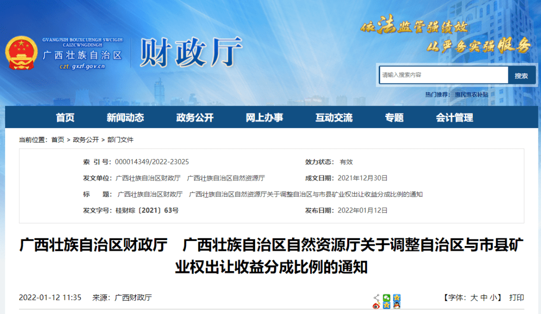 與此同時,廣西壯族自治區自然資源廳《關于印發全面推進砂石土類礦產“凈采礦權”出讓工作的通知》和《關于調整自治區與市縣礦業權出讓收益分成比例的通知》。明確廣西壯族自治區從2022年起全面實行砂石土類礦產"凈礦"出讓,鼓勵推進其他礦產"凈礦"出讓;礦業權出讓收益分成向基層傾斜,自治區本級分成比例調減10%以上。