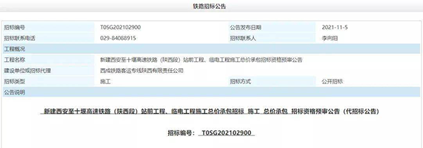 11月5日,在初步設(shè)計(jì)批復(fù)以后,《新建西安至十堰高速鐵路(陜西段)站前工程、臨電工程施工總價(jià)承包招標(biāo)資格預(yù)審公告》、《新建西安至十堰高速鐵路(陜西段)“四電”系統(tǒng)集成工程施工總價(jià)承包招標(biāo)》正式發(fā)布。