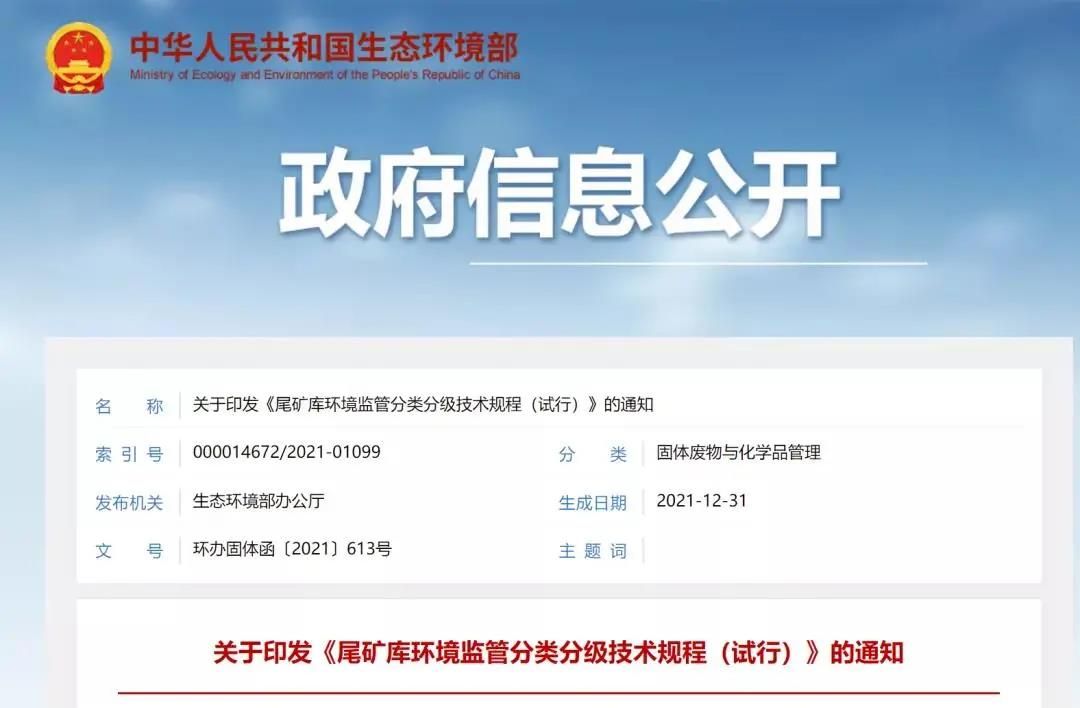 近日,生態(tài)環(huán)保部網(wǎng)站公布關(guān)于引發(fā)《尾款庫(kù)環(huán)境保護(hù)分類(lèi)分級(jí)技術(shù)規(guī)程(試行)》的通知。根據(jù)通知《尾款庫(kù)環(huán)境保護(hù)分類(lèi)分級(jí)技術(shù)規(guī)程(試行)》,該技術(shù)規(guī)程于2021年12月31日生成。這是尾款庫(kù)監(jiān)督管理方面極其重要的一項(xiàng)新的技術(shù)規(guī)程。